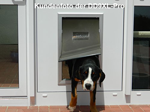 Siehe auch Modell DD9S-Pro mit Durchgangsöffnung 17 x 22 cm für kleinere Hunde und Katzen, DD9M-Pro mit Durchgangsöffnung von 22 x 30 cm für Hunde bis 40 cm Schulterhöhe und XL-Hundeklappe DD9XL-Pro mit Durchgangsmaß 36 x 61 cm für große Hunde mit bis zu 72 cm Größe